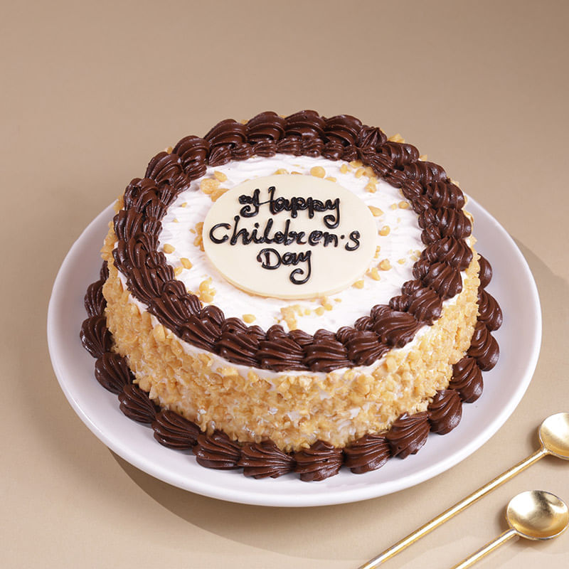 A sweet reminder of simple joys, this Children’s Day cake brings a warm, familiar happiness with every bite. The butterscotch swirls, creamy white frosting, and crunchy nut-covered sides create a comforting mix of textures kids love. The hand-piped message on top adds a classic celebratory touch, making it perfect for families who enjoy traditional flavours wrapped in a festive moment. It’s homely, nostalgic, and made to brighten the day in the most effortless way.