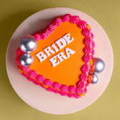 A burst of colour and celebration, the Bride Era cake brings the perfect mix of fun and elegance to any pre-wedding moment. The heart shape adds a touch of romance, while the bright orange base and vivid pink piping create a lively visual pop. Silver spheres lend a modern, playful edge that guests can’t miss. Once cut, the soft layers offer a smooth, satisfying bite that feels just right for the occasion. It’s a picture-ready centrepiece that makes the bride feel adored and turns the celebration into a memory worth keeping.