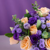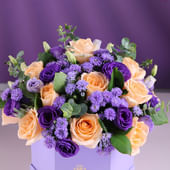 A graceful symphony of blooms, this arrangement features peach roses paired with purple eustoma, their velvety petals adding depth and charm. Sprinkled among them, blue daisies lend a soft, cheerful contrast, creating a lively yet balanced palette. All these blossoms are artistically gathered in a premium purple box, making the ensemble both stylish and heartfelt. Perfect for gifting, this floral box brings elegance and warmth into any room while expressing emotions that words alone cannot capture. A thoughtful choice for celebrations, milestones, or simply brightening someone’s day.