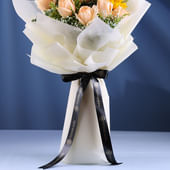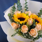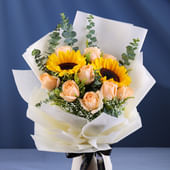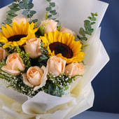 A radiant blend of warmth and elegance, this bouquet features sunflowers that shine with cheerful brilliance, paired with peach roses that exude softness and charm. Fresh eucalyptus stems weave through the arrangement, adding a touch of earthy elegance and a refreshing scent. Wrapped in pristine white non-woven paper and tied with a sleek ribbon, the ensemble strikes a balance between vibrancy and sophistication. Perfect for uplifting spirits, conveying heartfelt emotions, or gifting a thoughtful surprise, this bouquet captures the beauty of sunshine and tenderness in one graceful creation.