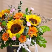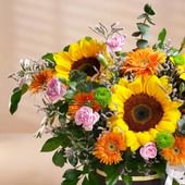 Bright and full of charm, this floral arrangement brings together radiant sunflowers, cheerful gerberas, soft spray carnations, green button blooms, and delicate limonium. Fresh eucalyptus and kamini leaves add a lush, natural touch, all set beautifully in a sleek black box with a graceful ribbon. Supported by an oasis base for long-lasting freshness, this bouquet makes a striking gift that lights up any room and lifts every mood with its sunny, vibrant presence.