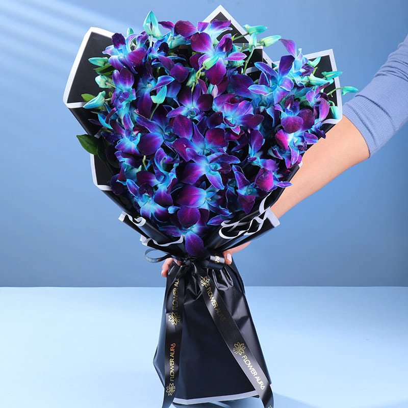Captivate their heart with the enchanting allure of this Orchids bouquet in black wrapping paper. This exquisite flower bouquet is a mesmerizing sight, showcasing the velvety midnight blue hue of stunning orchids. Each delicate blossom is meticulously arranged amidst lush green leaf fillers, symbolizing everlasting beauty and grace. Wrapped in elegant black paper with a white thread bow, this floral gift exudes an air of mystery and sophistication. Perfect for gifting, it holds the power to convey profound emotions and leave a lasting impression. Let these captivating orchids illuminate the recipient's world, filling it with wonder and joy.