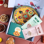 This hamper offers a burst of festive charm packed in one delightful box. It includes a vibrant yellow Thali, adorned with intricate embellishments, instantly setting the tone for celebration. Accompanying it are Besan Ladoos that melt in the mouth with every bite. Paan raisins lend a refreshing twist with their unique fusion of sweetness and spice, while Kalimirch cashews deliver a nutty crunch with a subtle peppery kick. Perfectly curated for Bhai Dooj, Raksha Bandhan, and other auspicious occasions, this gift embodies both warmth and grandeur, making every ritual more special.