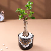 This Bonsai plant brings a sense of calm and elegance to any space. Its sturdy trunk and fresh green leaves create a balanced, sculpted look that instantly draws the eye. Housed in a striking black Mandala pot, the design adds an artistic touch that feels both modern and rooted in tradition. The layer of white pebbles enhances the overall aesthetic, giving the plant a serene finish. Whether you're gifting it or placing it in your own home, this Bonsai is a beautiful way to add life, harmony and a hint of sophistication.
